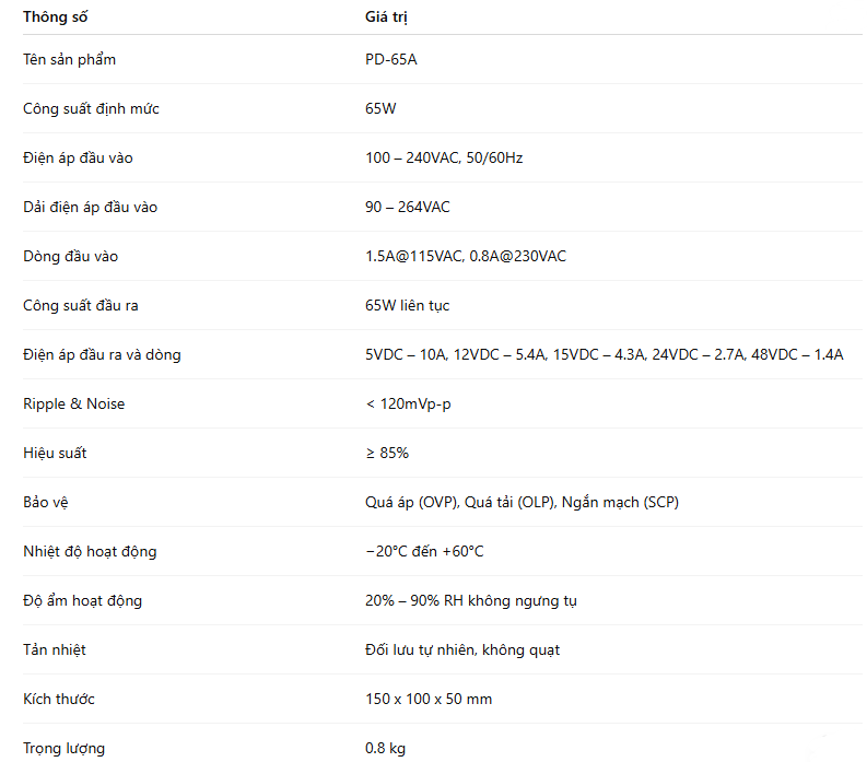 PD-65A là bộ nguồn AC/DC công suất 65W thuộc phân khúc nguồn công nghiệp nhỏ gọn, thiết kế để cung cấp điện áp DC ổn định cho các thiết bị điều khiển, cảm biến, module I/O, máy móc tự động hóa và thiết bị điện tử công suất nhỏ đến trung bình. Đây là dòng sản phẩm được đánh giá cao nhờ độ bền, hiệu suất, sự ổn định và tuổi thọ vượt trội so với nhiều bộ nguồn giá rẻ trên thị trường.