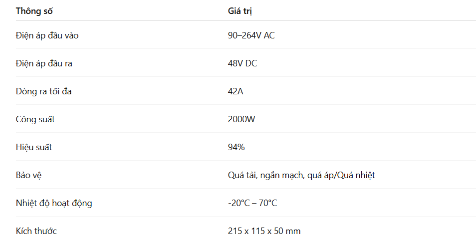 RSP-2000-48 là bộ nguồn DC 48V 2000W đáng tin cậy, ổn định và hiệu quả. Với thiết kế chắc chắn, hiệu suất cao, bảo vệ toàn diện và tuổi thọ lâu dài, đây là lựa chọn lý tưởng cho kỹ sư, nhà thiết kế hệ thống và doanh nghiệp muốn vận hành liên tục, an toàn và hiệu quả. RSP-2000-48 – nguồn điện mạnh mẽ, đồng hành cùng mọi hệ thống công nghiệp và chiếu sáng LED công suất lớn.