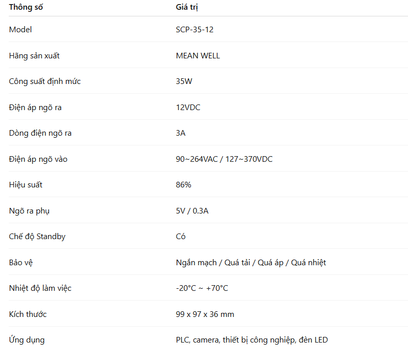 Thông số kỹ thuật MEAN WELL SCP-35-12