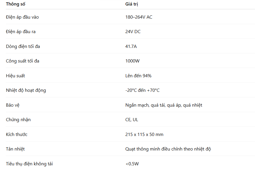 Bộ nguồn SD-1000H-24 là giải pháp tối ưu cho các hệ thống công nghiệp, tự động hóa và năng lượng tái tạo. Với công suất 1000W, dòng 41.7A, hiệu suất cao, bảo vệ toàn diện và thiết kế bền bỉ, SD-1000H-24 mang đến nguồn điện ổn định, an toàn và đáng tin cậy, đáp ứng mọi yêu cầu kỹ thuật của kỹ sư và doanh nghiệp cần bộ nguồn công nghiệp chuyên nghiệp và hiệu quả.