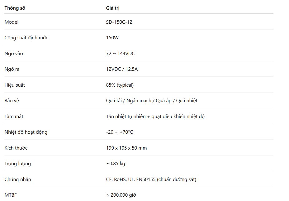 Dải điện áp ngõ vào rộng từ 72~144VDC khiến SD-150C-12 có thể thích ứng với nhiều hệ thống khác nhau, đặc biệt trong đường sắt đô thị, tàu điện, xe điện chuyên dụng, nơi nguồn DC cao áp là tiêu chuẩn.