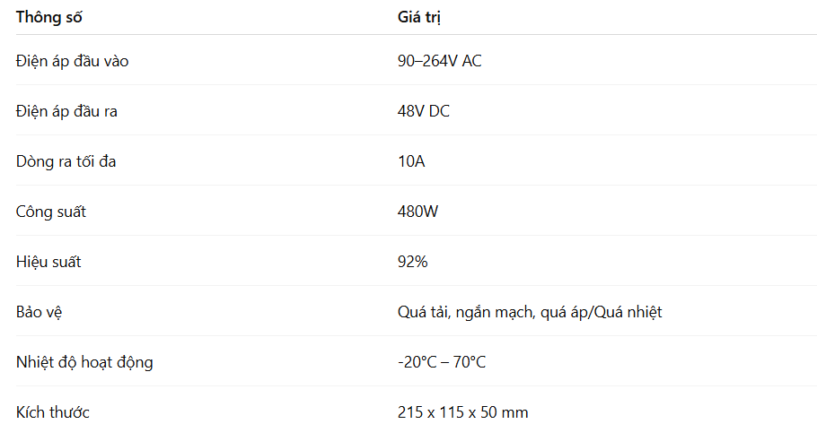 SDR-480-48 là bộ nguồn DC 48V 480W đáng tin cậy, ổn định và hiệu quả. Với thiết kế chắc chắn, hiệu suất cao, bảo vệ toàn diện và tuổi thọ lâu dài, đây là lựa chọn lý tưởng cho kỹ sư, nhà thiết kế hệ thống và doanh nghiệp muốn vận hành liên tục, an toàn và hiệu quả. SDR-480-48 – nguồn điện mạnh mẽ, đồng hành cùng mọi hệ thống công nghiệp và chiếu sáng LED công suất lớn.