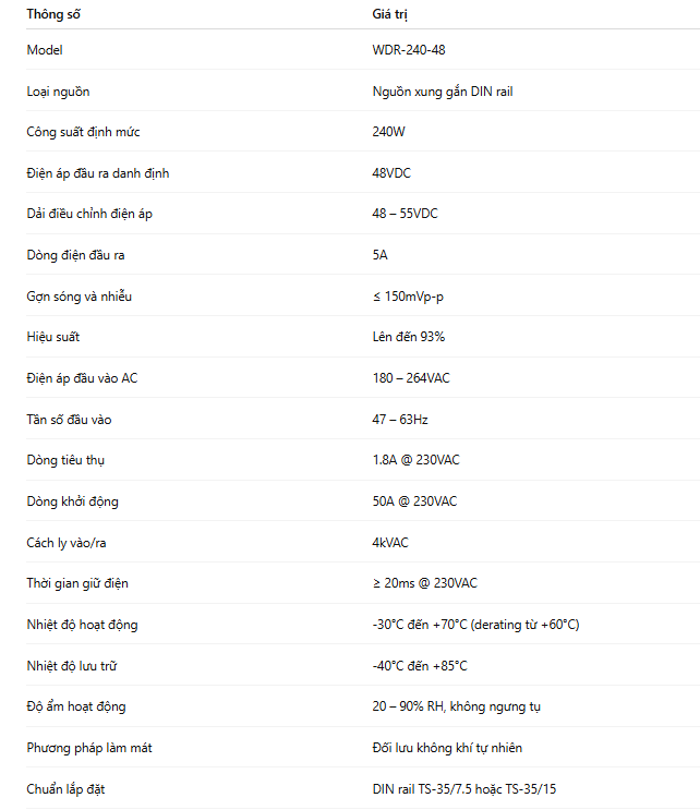 Các thông số ngõ ra chính của WDR-240-48 bao gồm: