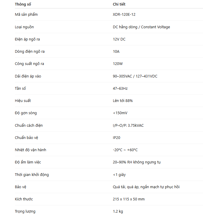 Với cơ chế bảo vệ toàn diện bao gồm chống quá tải, quá áp, ngắn mạch và bảo vệ nhiệt tự phục hồi, XDR-120E-12 mang lại sự an tâm tuyệt đối cho các kỹ sư, nhà thầu và chủ đầu tư, giúp hệ thống vận hành liên tục 24/7 mà không gặp sự cố. Thiết kế bền bỉ, chống bụi, chống nhiệt, chuẩn DIN-Rail cho phép lắp đặt dễ dàng, bảo trì thuận tiện và đảm bảo vận hành ổn định trong mọi điều kiện môi trường, từ nhà xưởng, tủ điện đến các dự án ngoài trời.