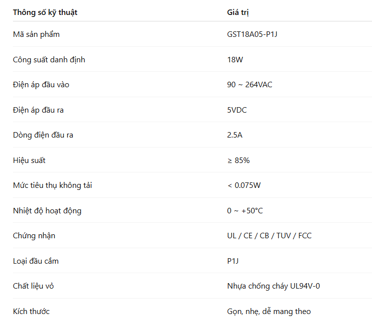 Tóm lại, GST18A05-P1J không chỉ là bộ nguồn nhỏ gọn mà còn là giải pháp cấp điện linh hoạt, bền bỉ và đáng tin cậy cho mọi nhu cầu từ dân dụng đến công nghiệp. Nhờ khả năng thích nghi cao, hiệu suất ổn định và chứng chỉ quốc tế đầy đủ, sản phẩm này thực sự là một lựa chọn toàn diện cho mọi môi trường ứng dụng.