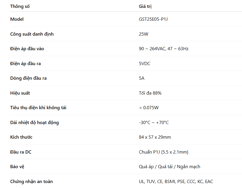 Với công suất định mức 25W và điện áp đầu ra 5V DC ổn định tuyệt đối, GST25E05-P1J không chỉ là một adapter thông thường mà còn là giải pháp cấp nguồn chuyên nghiệp cho nhiều lĩnh vực khác nhau.