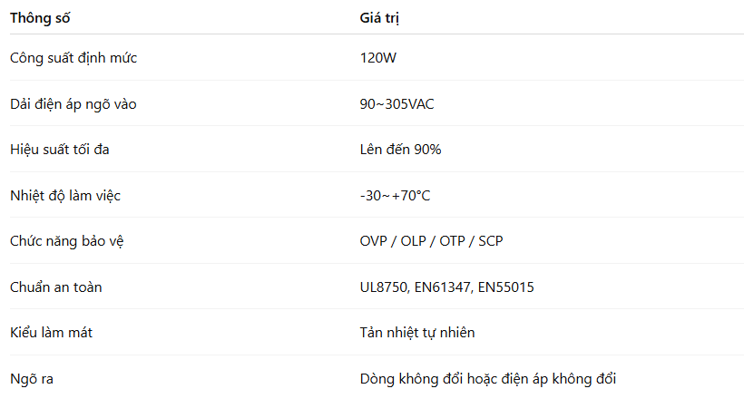 Trong lĩnh vực chiếu sáng hiện đại, bộ nguồn đóng vai trò then chốt trong việc đảm bảo hiệu suất, tuổi thọ và sự ổn định của hệ thống. Model Meanwell LAD-120B được thiết kế dành riêng cho các ứng dụng LED, mang lại công suất 120W cùng hiệu suất chuyển đổi vượt trội, đáp ứng tiêu chuẩn cao nhất của ngành chiếu sáng công nghiệp và dân dụng.