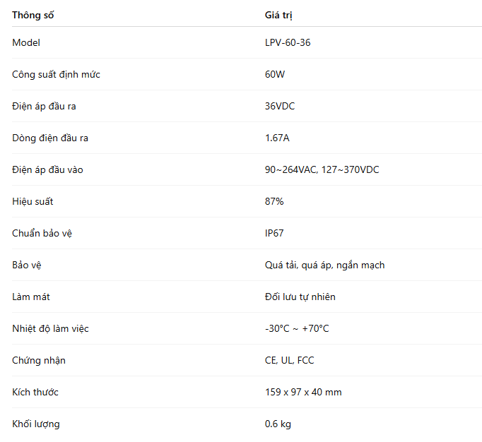 Với các tính năng nổi bật này, LPV-60-36 không chỉ đơn thuần là bộ nguồn DC-DC, mà còn là một giải pháp năng lượng thông minh, bền bỉ và an toàn cho mọi hệ thống công nghiệp, chiếu sáng LED, viễn thông, hay các dự án tự động hóa hiện đại. Thiết kế thông minh kết hợp hiệu suất cao, khả năng chịu môi trường khắc nghiệt và bảo vệ toàn diện giúp LPV-60-36 trở thành một trong những bộ nguồn DC đáng tin cậy nhất trên thị trường hiện nay.