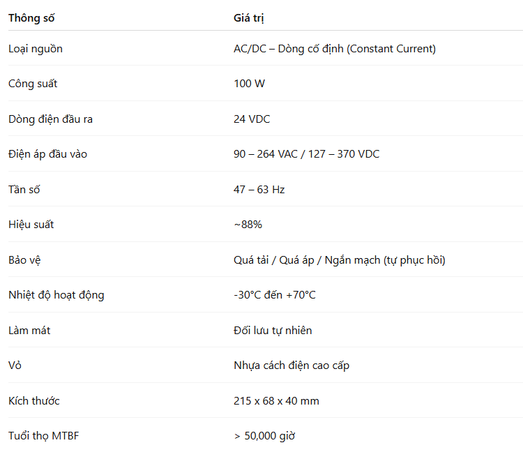 Nhìn chung, XLG-100-24-A là sự lựa chọn lý tưởng để triển khai các hệ thống LED hiện đại, an toàn, ổn định và đáng tin cậy, đồng thời tạo nền tảng vững chắc cho các dự án chiếu sáng thông minh và năng lượng hiệu quả trong tương lai.
