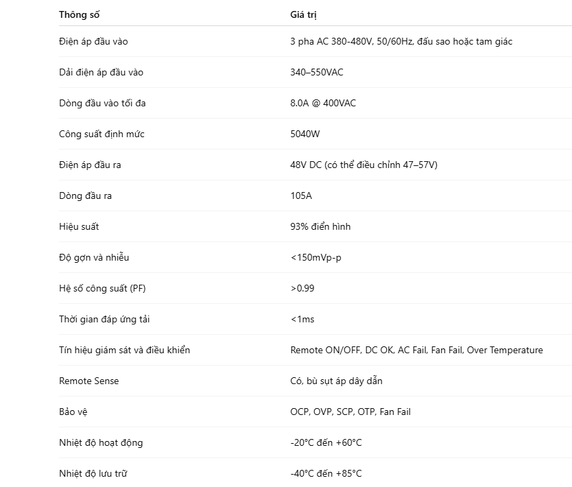 • 48: Điện áp đầu ra 48 Volt DC (VDC) – điện áp chuẩn cho viễn thông, trung tâm dữ liệu và nhiều ứng dụng công nghiệp công suất lớn.