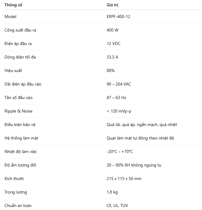 ERPF-400-12 còn được trang bị quạt làm mát thông minh, có khả năng tự điều chỉnh tốc độ dựa trên nhiệt độ bên trong bộ nguồn. Điều này vừa giúp giảm tiếng ồn, vừa đảm bảo hệ thống linh kiện không bị quá nhiệt, kéo dài tuổi thọ tổng thể của sản phẩm. Hệ thống làm mát kết hợp tản nhiệt chủ động và thụ động cho phép bộ nguồn hoạt động liên tục ở công suất cao mà không giảm hiệu suất, rất phù hợp cho các nhà máy, xưởng sản xuất hay tủ điện công nghiệp có tải lớn và yêu cầu vận hành liên tục.