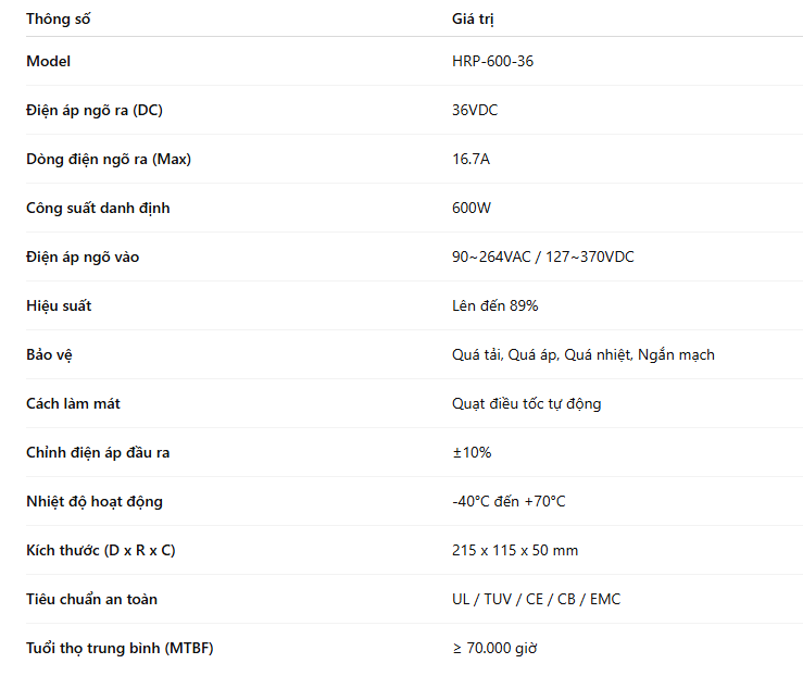 Tất cả những tính năng này hợp lại tạo nên một lớp giáp bảo vệ vững chắc, giúp HRP-600-36 không chỉ là một bộ nguồn điện, mà còn là một trung tâm năng lượng an toàn, thông minh và ổn định, đủ sức đảm bảo vận hành liên tục 24/7 trong mọi điều kiện khắc nghiệt.