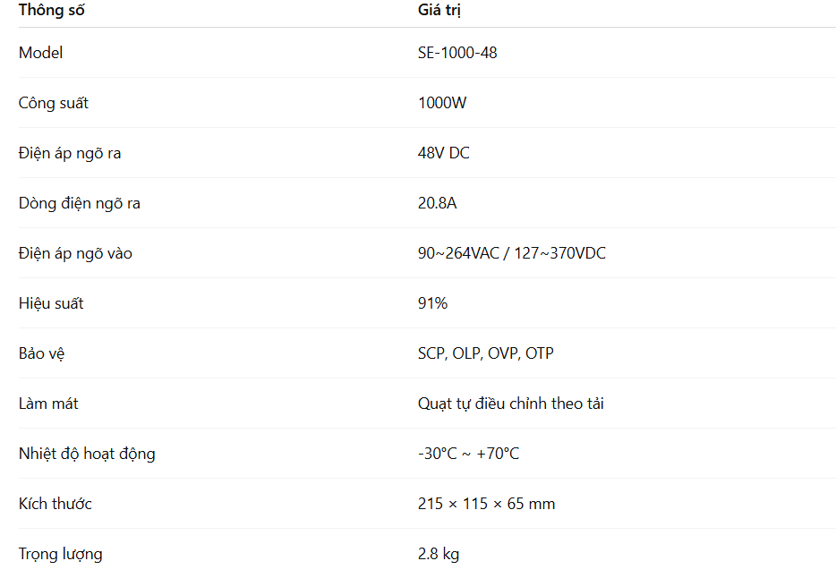 Với khả năng vận hành đa môi trường, SE-1000-48 thực sự là giải pháp linh hoạt, đáp ứng nhu cầu từ chiếu sáng công nghiệp đến tự động hóa, viễn thông hay các thiết bị chuyên dụng.
