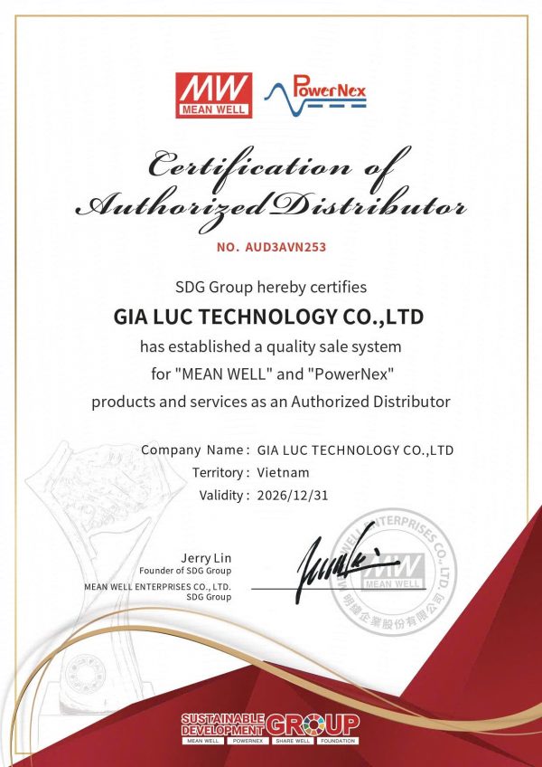 Gia Lực Tech là đại lý ủy quyền chính thức của Mean Well tại Việt Nam đến năm 2026, chuyên cung cấp nguồn điện công nghiệp chính hãng với đầy đủ CO, CQ. Với đội ngũ kỹ sư kỹ thuật giàu kinh nghiệm, Gia Lực Tech không chỉ bán hàng mà còn tư vấn, hỗ trợ kỹ thuật tận nơi. Cam kết hàng chính hãng 100%, giá cạnh tranh, giao nhanh toàn quốc. Các dòng sản phẩm phân phối gồm: LRS, RSP, MDR, NDR, HLG, NPB, NCP… và nhiều model hot trend khác. Gia Lực Tech – giải pháp nguồn điện đáng tin cậy cho nhà máy, tủ điện, LED và tự động hóa.