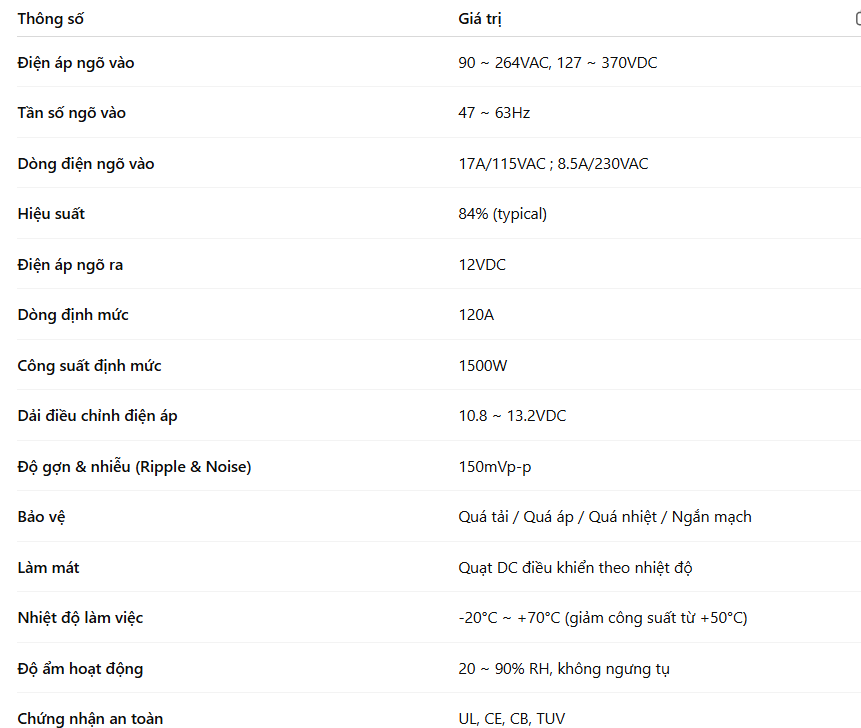 Bộ nguồn SE-1500-12 tuân thủ các tiêu chuẩn an toàn và EMC quốc tế, đạt chứng nhận UL, CE, CB… Nhờ đó, sản phẩm không chỉ được tin dùng tại Việt Nam mà còn xuất khẩu sang nhiều thị trường khó tính. Với tuổi thọ MTBF cao và chế độ vận hành liên tục 24/7, SE-1500-12 là lựa chọn lý tưởng cho các hệ thống yêu cầu độ tin cậy tuyệt đối.
