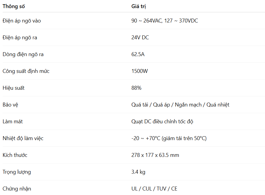 MEAN WELL SE-1500-24 không đơn thuần là một bộ nguồn 24V công suất 1500W. Nó là sự kết hợp giữa sức mạnh, hiệu suất, độ bền và an toàn, mang đến sự an tâm tuyệt đối cho người dùng.