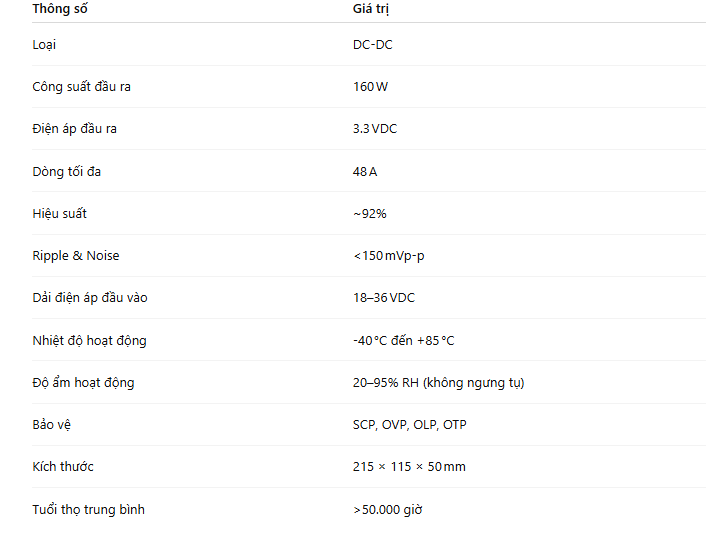 LSP-160-3.3T là bộ nguồn DC-DC công suất 160 W của MEAN WELL, được thiết kế để cung cấp nguồn 3.3 VDC ổn định, mạnh mẽ và liên tục cho các thiết bị công nghiệp, hệ thống tự động hóa, thiết bị đo lường và các dự án điện tử yêu cầu dòng điện lớn. Bộ nguồn này phù hợp cho các ứng dụng đòi hỏi dòng điện ổn định cao, khả năng chịu tải mạnh và vận hành liên tục 24/7, đồng thời đảm bảo an toàn và hiệu suất tối ưu trong mọi môi trường khắc nghiệt.
