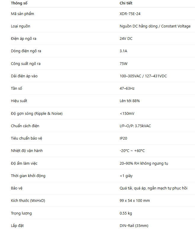 Nhìn chung, công suất 75W kết hợp với điện áp 24V chuẩn cho phép bộ nguồn đáp ứng hầu hết nhu cầu của tủ điều khiển công nghiệp tầm trung, đảm bảo vận hành liên tục 24/7 mà không lo về sự cố điện áp hoặc nhiễu hệ thống. Đây là lựa chọn đáng tin cậy cho kỹ sư cần nguồn 24V bền bỉ, chính xác và ổn định cho nhiều loại thiết bị khác nhau.