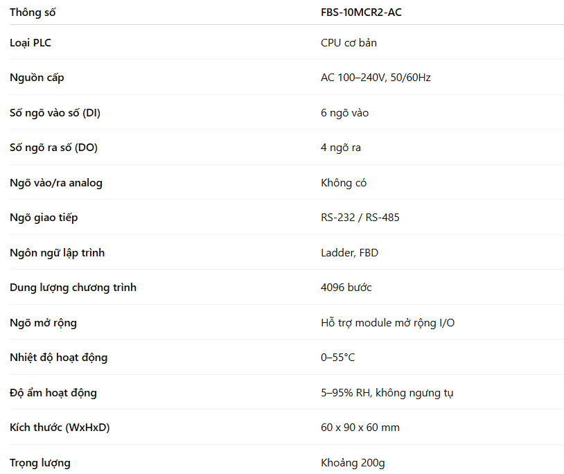 Kết hợp kích thước nhỏ gọn, dây đấu dễ thao tác, độ bền cao và mạch I/O ổn định, FBs-10MCR2-AC trở thành lựa chọn rất phù hợp cho các ứng dụng tiết kiệm không gian nhưng yêu cầu độ tin cậy cao như máy đóng gói nhỏ, dây chuyền mini, tủ điều khiển chiếu sáng, máy cấp liệu, máy bán tự động hoặc các mô-đun điều khiển độc lập trong nhà máy.
