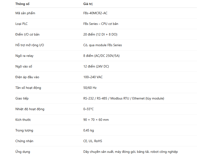 FBs‑40MCR2‑AC đảm bảo thời gian phản hồi nhanh, độ chính xác cao và khả năng mở rộng I/O linh hoạt, phù hợp cho các dự án dài hạn, nơi thời gian chết là tối thiểu.
