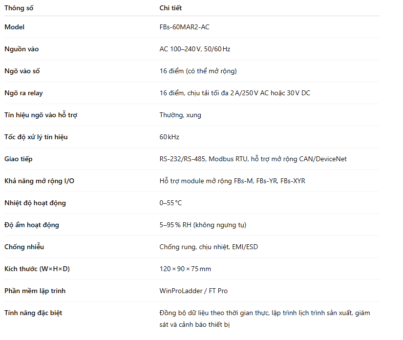 PLC Fatek FBs-60MAR2-AC là bộ điều khiển logic khả trình cỡ lớn trong series FBs, tích hợp 60 điểm I/O và ngõ vào analog, cung cấp giải pháp toàn diện cho các hệ thống điều khiển công nghiệp quy mô lớn.