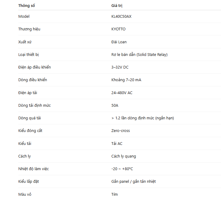 Tổng thể, SSR KYOTTO KL40C50AX không chỉ là giải pháp thay thế rơ le cơ truyền thống, mà còn là lựa chọn tối ưu cho các hệ thống điện công nghiệp hiện đại, nơi yêu cầu vận hành êm ái, chính xác, bền bỉ và tiết kiệm chi phí về lâu dài.
