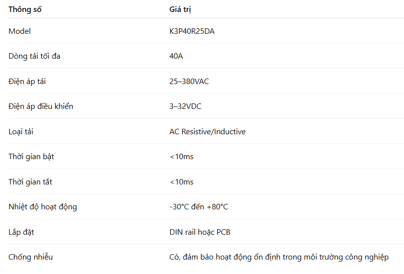 Ngoài các chức năng cơ bản trên, K3P40R25DA còn tích hợp khả năng chống nhiễu điện và dao động tín hiệu, giúp bảo vệ mạch điều khiển và tải khỏi các xung điện bất thường. Điều này đảm bảo rằng các thiết bị công nghiệp vẫn hoạt động mượt mà, chính xác và an toàn trong mọi điều kiện vận hành.