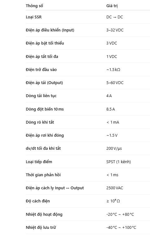 KYOTTO KF0604D còn nổi bật với khả năng đóng/ngắt nhanh, thời gian phản hồi dưới 1ms, đảm bảo các ứng dụng yêu cầu tốc độ cao như điều khiển motor DC, van điện từ, đèn LED công suất hoặc các thiết bị cảm ứng khác hoạt động chính xác và an toàn. Khả năng cách ly điện áp 2500 VAC giữa đầu vào và đầu ra không chỉ bảo vệ mạch điều khiển mà còn tăng tính an toàn và tin cậy cho toàn hệ thống, đặc biệt trong các ứng dụng công nghiệp hoặc tự động hóa yêu cầu vận hành liên tục.