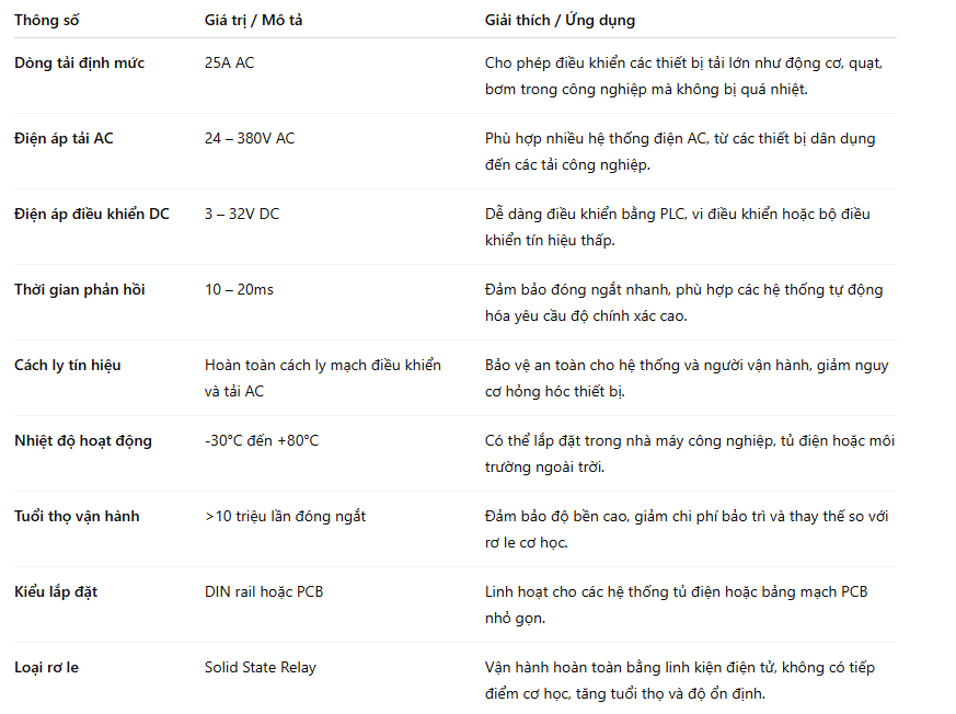 Rơ le bán dẫn SSR KG1025D là thiết bị điện tử hiện đại, được thiết kế để đóng ngắt tải AC một cách chính xác, nhanh chóng và bền bỉ. Sản phẩm đặc biệt phù hợp cho các hệ thống tự động hóa công nghiệp, chiếu sáng LED, hệ thống HVAC, cũng như các dự án năng lượng tái tạo. Không có tiếp điểm cơ học, KG1025D vận hành êm ái, không tạo tia lửa và có tuổi thọ vượt trội so với rơ le cơ thông thường.