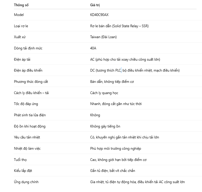 Nhìn chung, KD40C90AX không chỉ là một rơ le bán dẫn thông thường, mà là giải pháp đóng cắt tải công suất lớn an toàn – ổn định – bền bỉ, đáp ứng tốt các tiêu chuẩn kỹ thuật trong môi trường công nghiệp hiện đại.