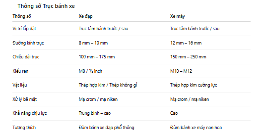 Trong quá trình lắp đặt trục và cổ nan hoa, cần lựa chọn đúng kích thước phù hợp với từng loại xe để đảm bảo độ chính xác và an toàn khi vận hành. Việc sử dụng sai kích thước có thể dẫn đến tình trạng lỏng trục, lệch bánh hoặc giảm tuổi thọ của các chi tiết liên quan.