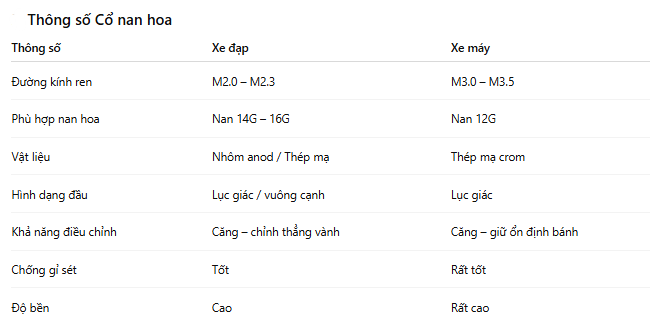 Thiết kế cổ nan hoa có dạng lục giác hoặc vuông cạnh, giúp việc siết và căn chỉnh trở nên dễ dàng bằng dụng cụ chuyên dụng. Phần ren được gia công chính xác, ăn khớp chắc với nan hoa, hạn chế trờn ren và giữ độ căng ổn định trong thời gian dài. Nhờ đó, bánh xe duy trì được độ ổn định, giảm rung lắc và tăng độ an toàn khi di chuyển.