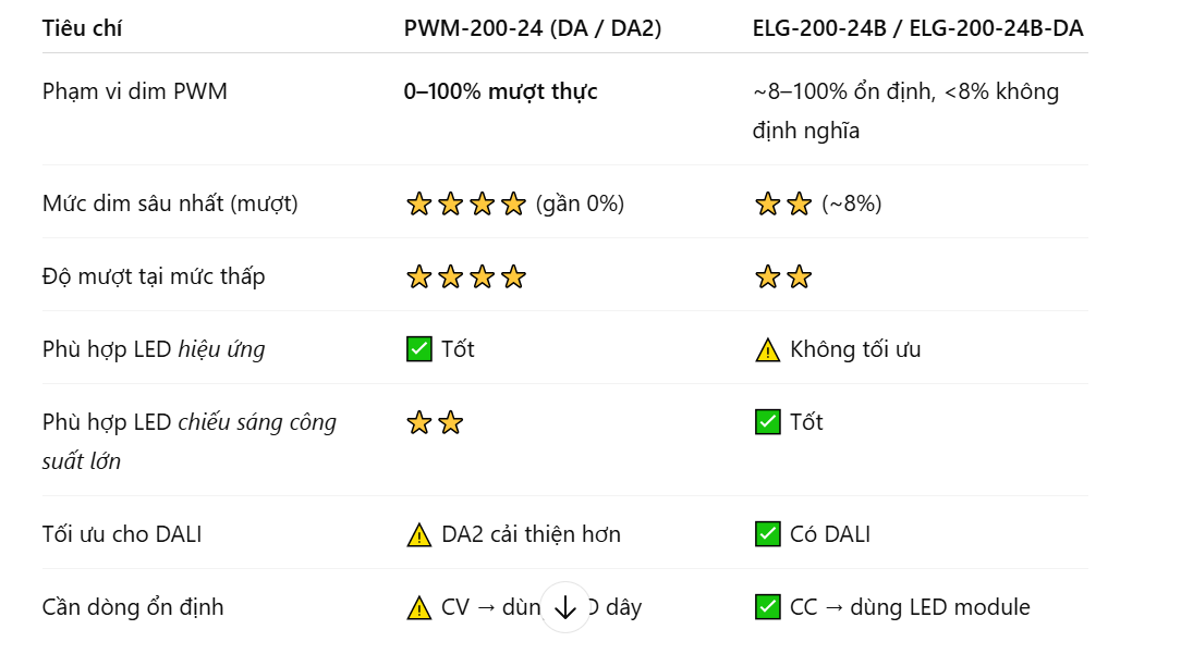 ✨ Tóm lại: nếu bạn cần hiệu ứng dim thật sự mượt ở mọi mức sáng, chọn PWM-200-24 / PWM-200-24DA2.