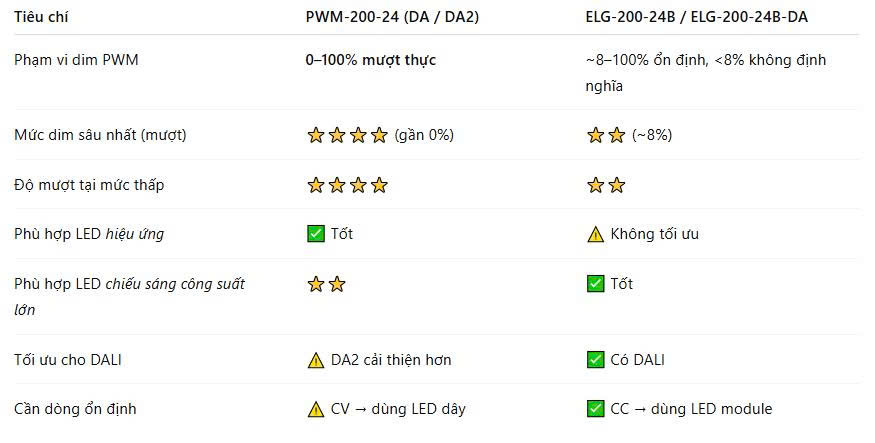 ✨ Tóm lại: nếu bạn cần hiệu ứng dim thật sự mượt ở mọi mức sáng, chọn PWM-200-24 / PWM-200-24DA2. Nếu bạn cần driver công suất cao và ổn định cho LED chiếu sáng lớn, chọn ELG-200-24B / ELG-200-24B-DA.